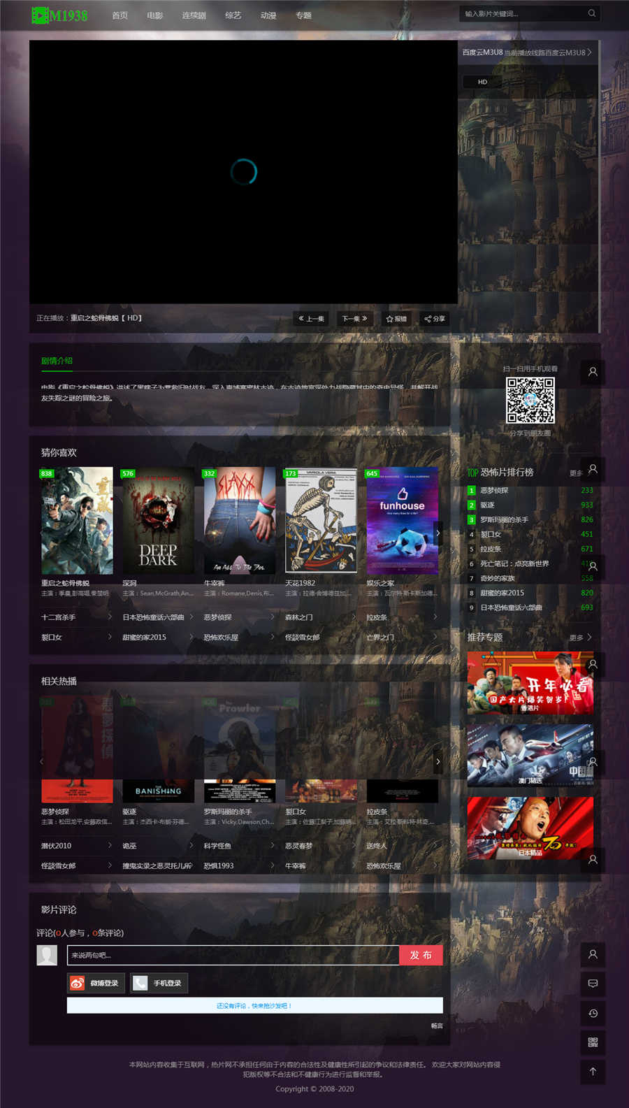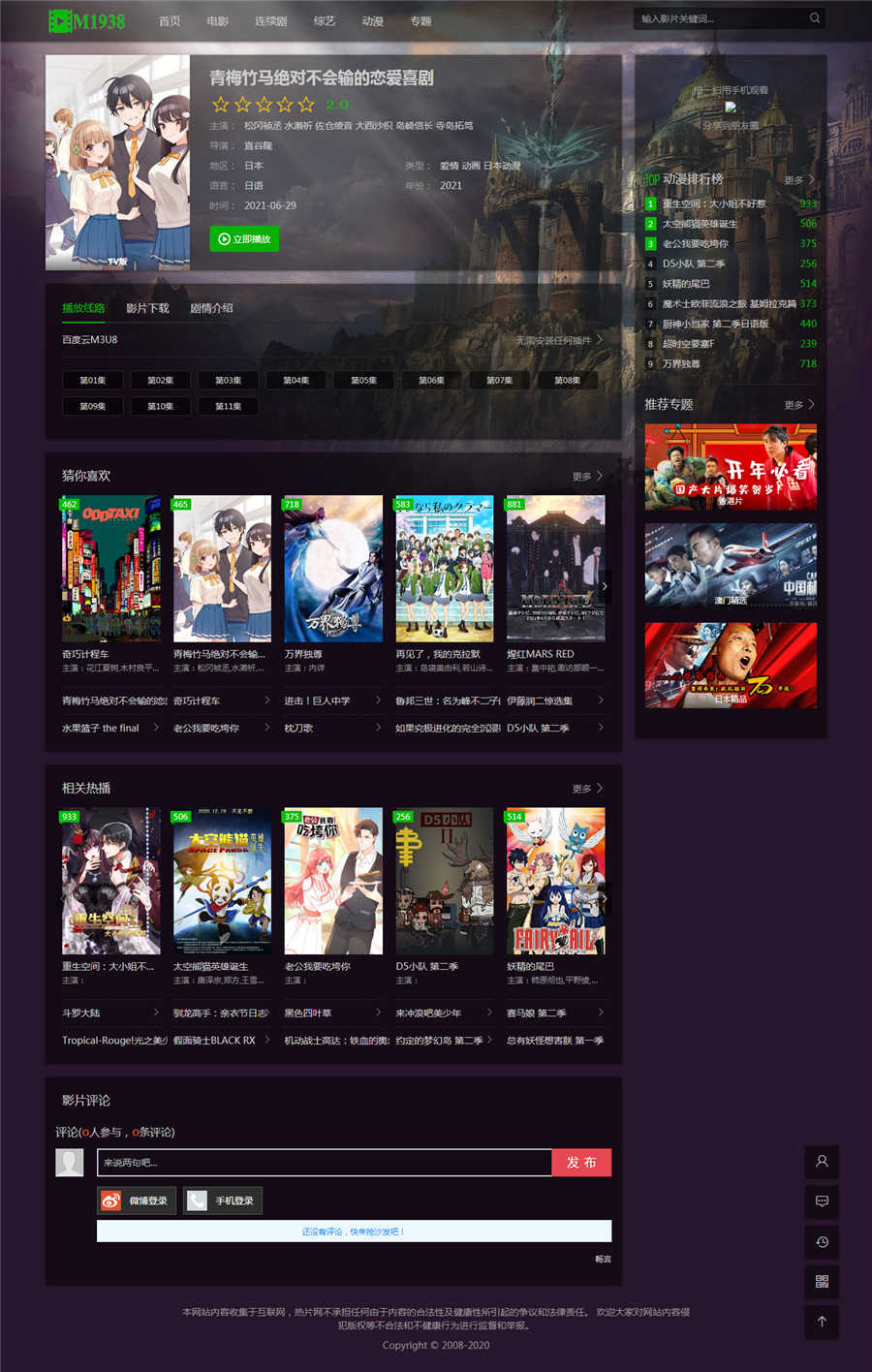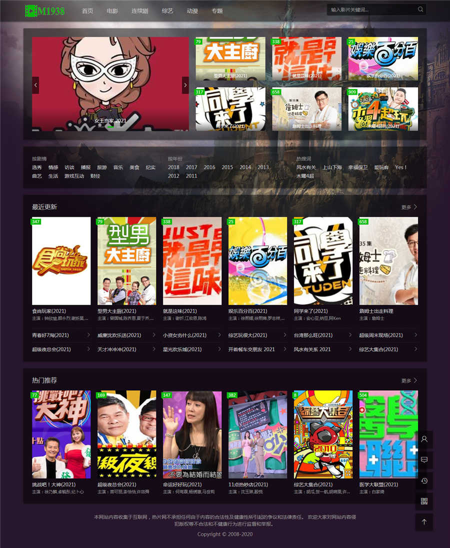| 模板安装教程: 注意.安装前一定要做好备份 1.将模板m1938U上传至网站template文件夹内。 2.登陆苹果cms后台-系统管理-当前使用模板-选择M1938U 3.模板html目录更换为:m1938chtml 5.首页和幻灯大图推荐内容为9.并在推荐内容上传幻灯大图. 6.点击数据缓存更新,内存数据更新,文件缓存更新。 7.点击站点首页查看效果吧! 注意:本模板只适用于苹果cmsv10程序 模板截图: |