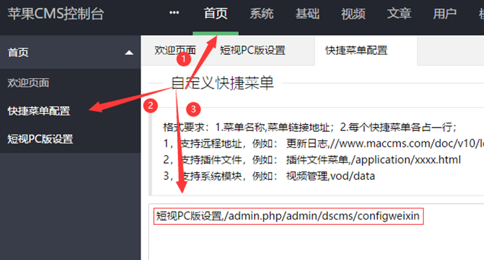 登录网站后台-首页-快捷菜单-粘贴上短视控制器路径-保存—进入后台启用